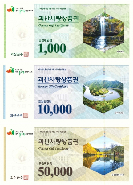 2022년에도 코로나19로 인한 소비심리 위축으로 침체된 지역경제를 살리기 위해 개인구매 시 10%, 법인구매 시 6%할인 판매를 계속 시행하며 괴산사랑상품권의 디자인도 변경해 출시한다.