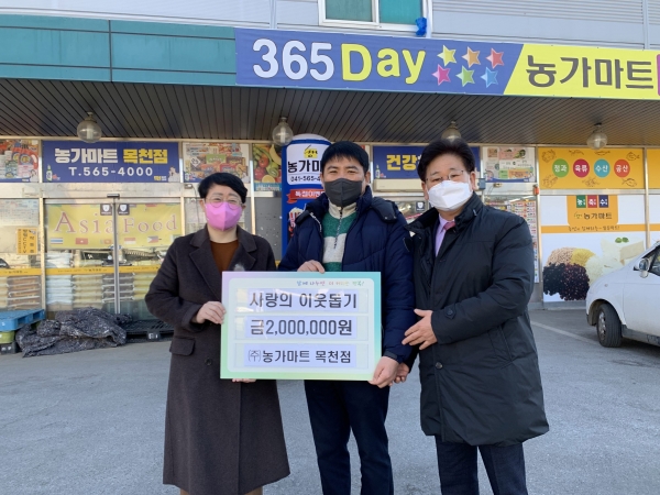 농가마트 목천점은 매해 관내 주민을 위해 정기적으로 후원을 실천하고 있으며 이날 기부금은 목천읍 복지 사각지대에 처한 주민들의 생활 안정을 위해 쓰일 예정이다.