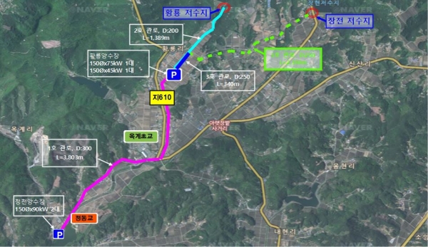 이 사업을 통해 청천저수지에서 황룡저수지와 장현저수지까지 도수로 7.891km를 매설해 청천저수지의 여유수량을 두 저수지에 공급할 수 있게 됐다.