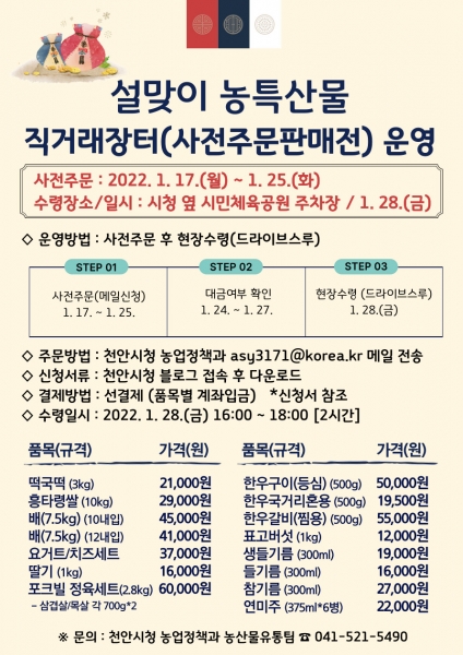 [충청뉴스큐] 천안시가 다가오는 설명절을 맞아 천안에서 생산되는 농산물과 특산물을 오는 25일까지 사전주문 받아 저렴한 가격에 판매한다.