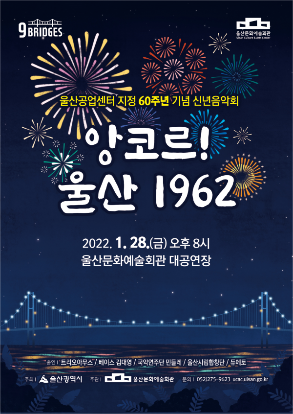 [충청뉴스큐] 울산문화예술회관은 오는 1월 28일 오후 8시 문화예술회관 대공연장에서 울산공업센터 지정 60주년을 맞아 시민과 함께 울산의 재도약을 응원하는 신년음악회 ‘앙코르 울산 1962’를 무대에 올린다고 밝혔다.