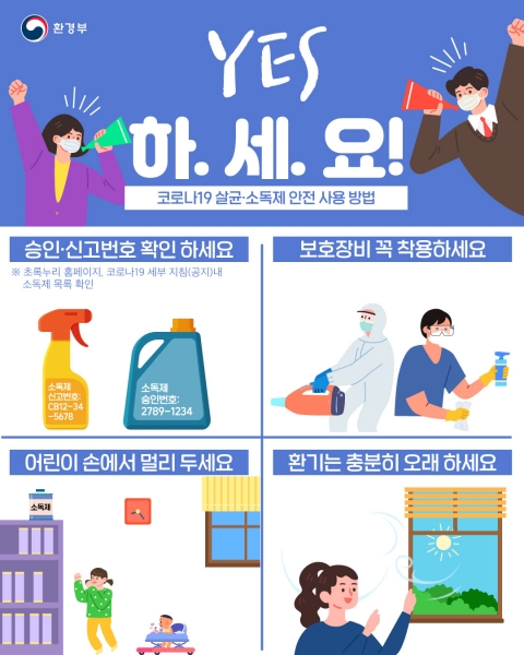 가정, 사무실 등 일상적 공간에서는 소독 시에는 손이 자주 닿는 곳을 중심으로 주 1회 이상 소독하고 아이들 장난감 등은 소독 후 입과 손에 닿아 위험하지 않도록 깨끗한 천으로 닦아 건조한 후에 사용해야 한다.