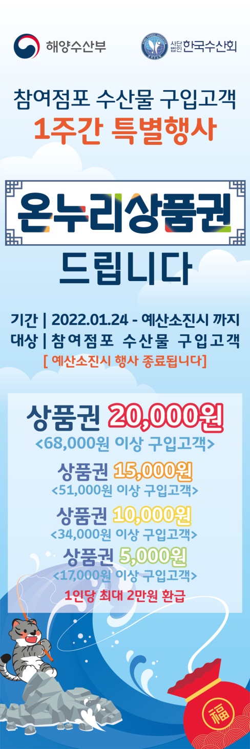 이 기간 동안 참여점포에서 국내산 수산물을 17,000원 이상 ~ 34,000원 미만 구매할 경우 온누리상품권 5천 원권을 지급하며 34,000원 이상 ~ 51,000원 미만은 온누리상품권 1만원, 51,000원 이상 ~ 68,000원 미만은 1만 5천원, 68,000원 이상은 2만원을 온누리상품권 환급받을 수 있다.