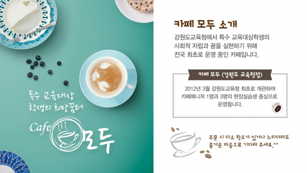 한편 카페모두는 2012년 3월 강원도교육청점 1호점을 시작으로 강원도교육연수원점, 원주교육문화관점, 삼척교육문화관점, 진로교육원점 등 현재 5호점까지 장애학생의 직업능력을 키우고 취업을 지원하고 있으며 장애학생들은 배우고 일하며 안정적으로 현장실습과 직업훈련을 받고 있다.