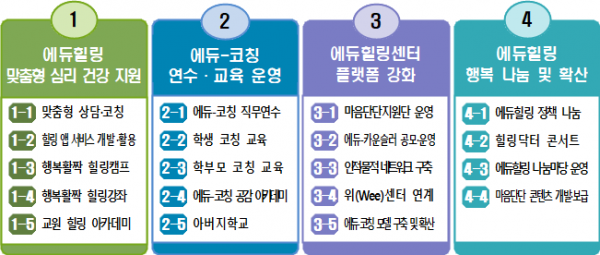 에듀힐링센터는 올해 맞춤형 심리 건강 지원, 에듀-코칭 연수·교육 운영, 에듀힐링센터 플랫폼 강화, 에듀힐링 행복 나눔 및 확산의 네 가지 핵심과제를 설정하고 상담 및 코칭, 힐링 프로그램, 연수 및 교육, 이를 지원하는 네트워크 구축 등 19개 세부 사업을 추진한다.