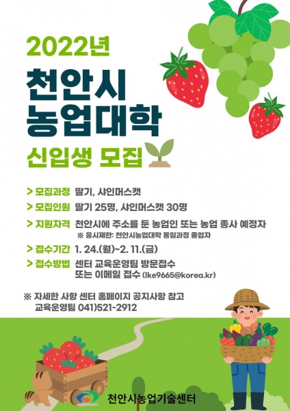 모집 대상은 천안시에 주소를 둔 농업인 또는 농업 종사 예정자이며 모집인원은 딸기 과정 25명, 샤인머스캣 30명으로 총 55명을 모집한다.