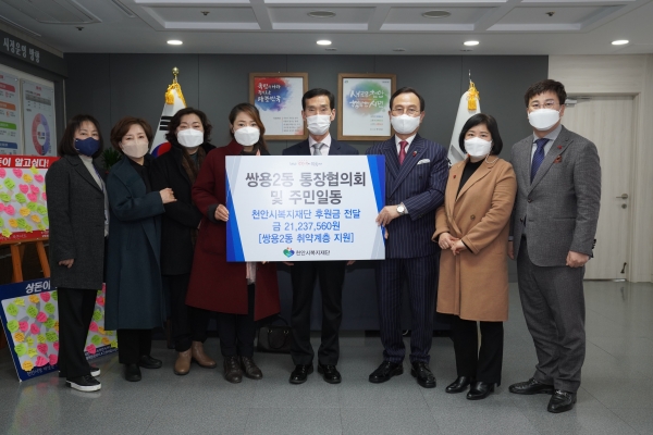 [충청뉴스큐] 천안시 쌍용2동 통장협의회와 주민들이 지난 24일 2021년 한 해 동안 모은 기부금 2123만7,560원을 충남사회복지공동모금회와 천안시복지재단에 전달했다.