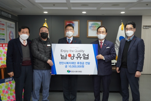 [충청뉴스큐] 남양유업 천안공장은 지난 24일 천안시청 시장실에서 설명절을 맞이해 관내 취약계층 지원을 위한 후원금 1,000만원을 천안시복지재단에 전달했다.