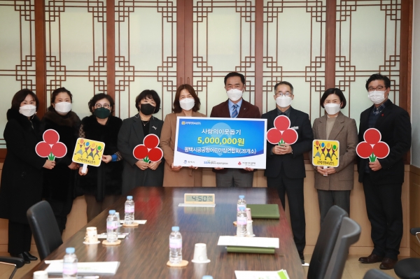 [충청뉴스큐] 평택시공공형어린이집연합회는 지난 20일 평택시청 대외협력실에서 평택행복나눔본부에 사랑의 이웃돕기 성금 500만원을 전달했다.