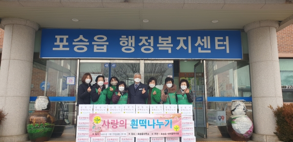 [충청뉴스큐] 평택시 포승읍새마을부녀회는 25일 포승읍행정복지센터 광장에서 2022년 임인년 설 명절을 맞아 주위 어려운 이웃과 어르신들을 위한 ‘설맞이 사랑의 흰떡 나눔행사’를 마련했다.