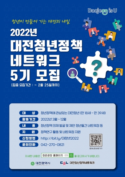 [충청뉴스큐] 대전시는 오는 27일부터 2월 25일까지 대전청년정책네트워크 5기 회원을 모집한다고 밝혔다.