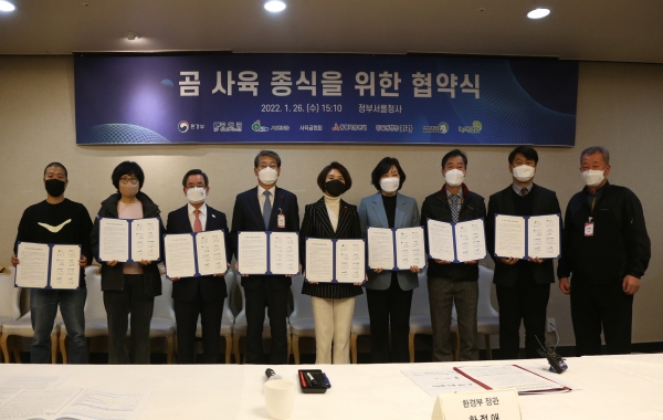 이날 정부서울청사에서 열린 협약식에는 한정애 환경부장관을 비롯해 노박래 서천군수, 김순호 구례군수, 김광수 사육곰협회 사무국장, 시민단체 관계자 등이 참석했다.