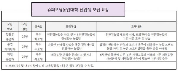 올해는 친환경농업과, 농업마케팅과, 체험농업과 등 3개 학과를 운영하며 학과별 25명씩 총 75명의 신입생을 모집한다.