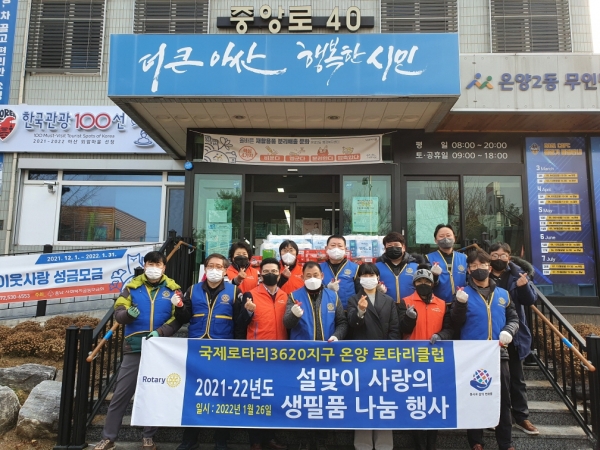 [충청뉴스큐]26일 온양로타리클럽이 설을 맞아 온양2동 행복키움추진단에 라면, 휴지, 세제 등 300만원어치 생필품을 후원했다.