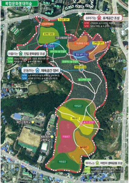 앞으로 군은 예산읍 중심에 위치한 봉대미숲 중앙공원을 본격 조성하기 위해 2022년 토지보상비로 20억을 확보했으며 2023년까지 중앙공원 지정 면적 21만9075㎡에 대한 보상을 완료할 계획이라고 전했다.