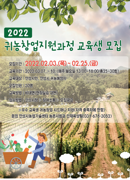 2022년 귀농창업지원과정은 안성시 귀농인 및 귀농예정자를 대상으로 오는 3월 7일부터 10월까지 매주 월요일 오후 1시 ~ 오후 6시, 총 20~25회 진행되며 새내기 농업인들의 조기 영농정착을 위한 귀농정책, 작목선택, 농업관련 법규 등 각 분야 전문가들을 초빙해 진행된다.