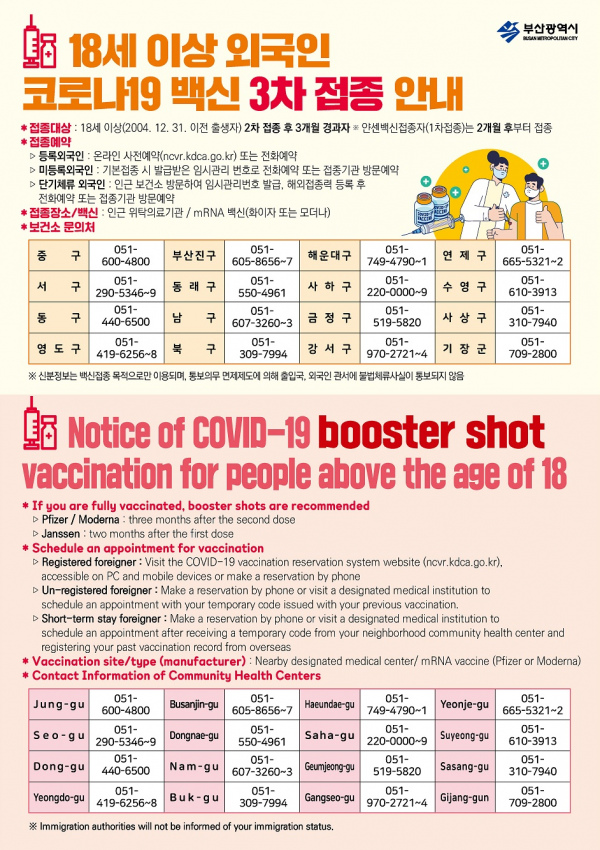 아울러 관할 보건소와 부산외국인주민지원센터, 지역 내 사업장 및 학교 등 관계기관과 협조해 적극적인 접종 참여를 유도할 계획이라고 전했다.