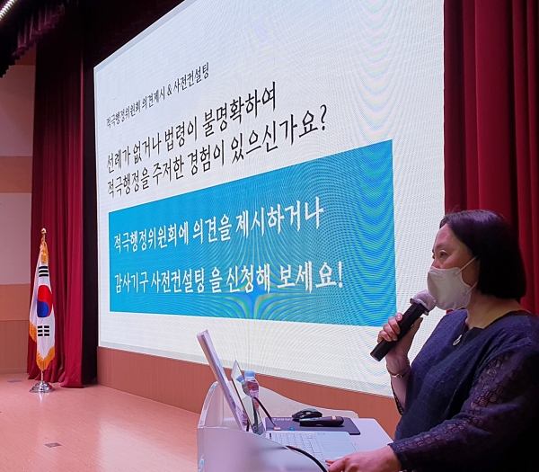 노정란 팀장은 “적극행정은 공직자가 불합리한 규제를 개선하는 등 공공의 이익을 위해 창의성·전문성을 바탕으로 적극적으로 업무를 처리하는 행위”며 “공직자들이 적극행정을 실천해 시민이 체감할 수 있는 긍정적인 변화를 이끌어야 한다”고 강조했다.