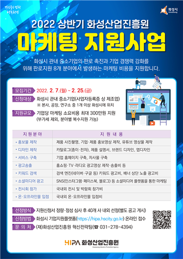 [충청뉴스큐] 화성산업진흥원이 화성시 중소 제조업의 판로개척 지원 및 기업 경쟁력 강화를 위해 7일부터 3주간 ‘2022년 상반기 화성산업진흥원 마케팅 지원사업’ 참가 기업을 모집한다.
