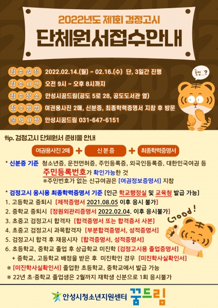 [충청뉴스큐] 안성시청소년지원센터 꿈드림은 오는 2월 14일부터 16일까지 3일간 2022년도 제1회 검정고서 단체원서접수를 실시한다고 밝혔다.