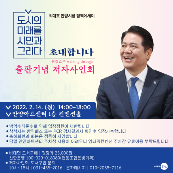 ‘도시의 미래를 시민과 그리다’ 정책에세이의 출판기념회는 2월 14일 월요일 오후 2시부터 6시까지 안양아트센터 1층 컨벤션홀에서 열린다.