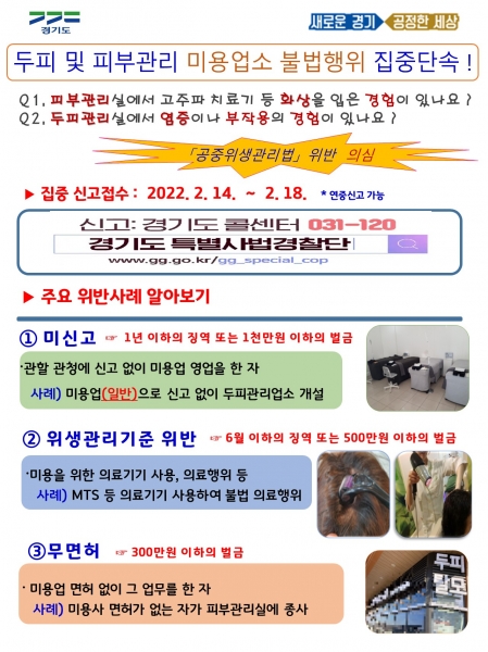 [충청뉴스큐] 경기도 특별사법경찰단이 최근 탈모환자 증가에 따른 두피·탈모 관리서비스 시장 확대에 따라 2월 14일부터 18일까지 수원, 화성, 용인, 오산, 고양, 파주 6개 지역에서 규모가 큰 가맹점 위주로 두피 및 피부관리 미용업소 90개소를 대상으로 미신고·무면허 등 불법행위를 집중 수사한다.