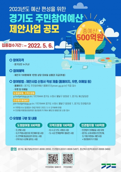 [충청뉴스큐] 경기도가 주민참여예산제의 하나로 2023년 예산 반영을 위한 주민제안사업을 오는 5월 6일까지 집중 접수한다.
