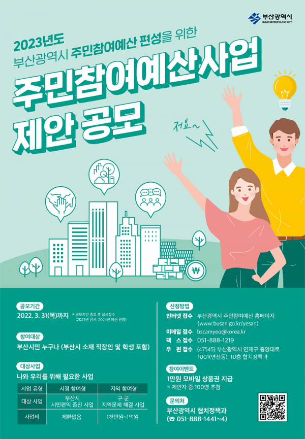 송삼종 부산시 행정자치국장은 “지역에 필요한 사업을 주민들이 직접 제안하고 예산편성 과정에도 직접 참여하는 주민참여예산제도를 통해 지역 공동체의 삶의 질을 스스로 바꿔나가는 경험을 해보시길 바란다”며 많은 시민들의 관심과 제안을 당부했다.