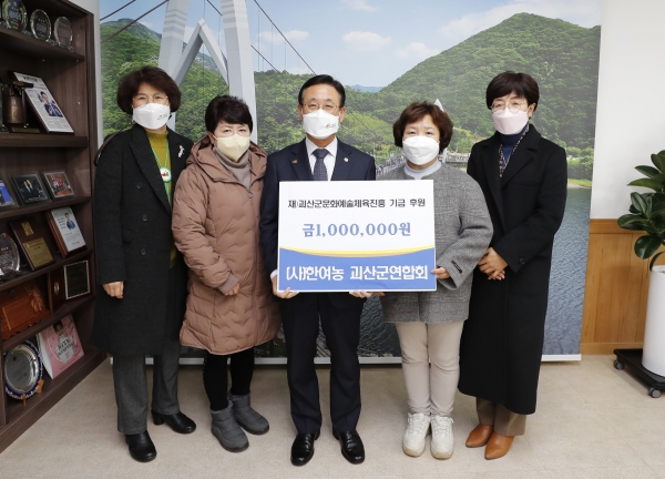[충청뉴스큐] 충북 괴산군은 ㈔한국여성농업인 괴산군연합회가 지난 7일 괴산군청을 방문해 괴산군 문화예술체육진흥기금 100만원을 기탁했다고 밝혔다.
