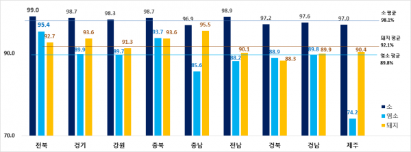 염소의 경우 전국평균보다 높은 시도는 전북, 충북, 경기, 경남 순이었고 강원, 경북, 전남, 충남, 제주 순으로 낮았다.