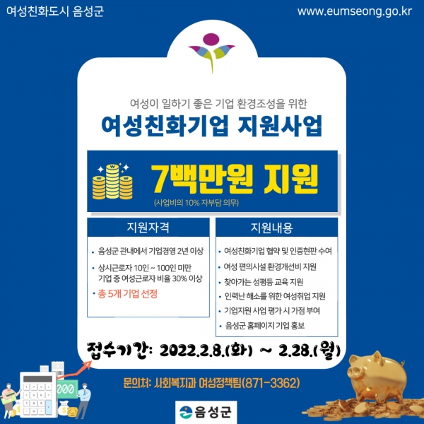 [충청뉴스큐] 음성군은 여성이 일하기 좋은 근로 환경 조성에 노력하는 기업을 여성친화기업으로 인증하고 환경개선 사업비를 지원하는 ‘여성친화기업 환경개선사업’에 관심이 있는 기업을 모집한다.