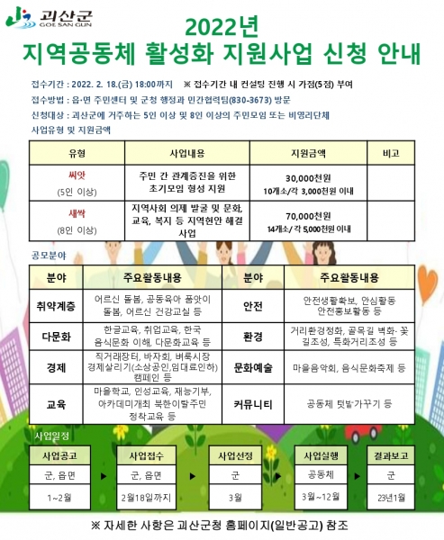 [충청뉴스큐] 충북 괴산군은 주민 간 관계증진을 위한 초기모임 형성과 지역사회 의제 발굴 및 문화, 교육, 복지 등 지역현안 해결에 관심 있는 주민모임 및 비영리단체를 지원하기 위한 ‘2022년 지역공동체 활성화 지원 사업’을 시행한다.