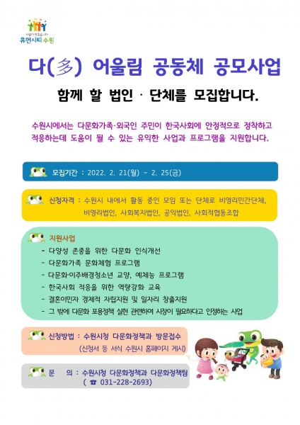 [충청뉴스큐] 수원시가 2월 21일부터 25일까지 ‘다어울림 공동체 공모사업’에 참여할 법인·단체를 모집한다.