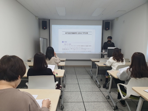 [충청뉴스큐] 청주시가 14일 청원구청 6층에서 청주365민원콜센터 상담사 25명을 대상으로 임시청사 이전과 코로나19 재택관리지원 상담센터 관련 직무교육 및 친절교육을 실시했다.