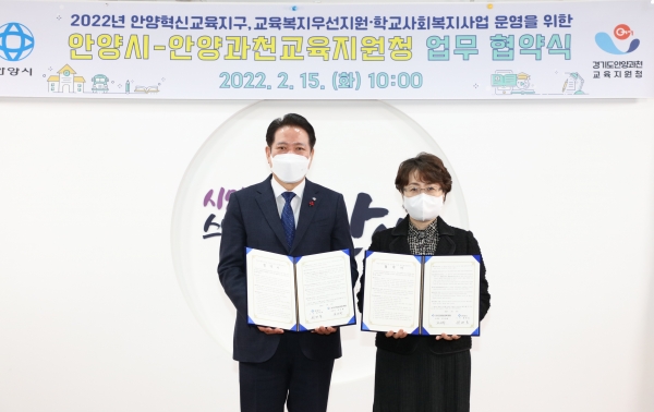 [충청뉴스큐] 안양시는 안양과천교육지원청과 2022년 안양혁신교육지구, 교육복지우선지원사업, 학교사회복지사업의 원활한 운영을 위해 15일 업무 부속합의 및 협약를 체결했다.