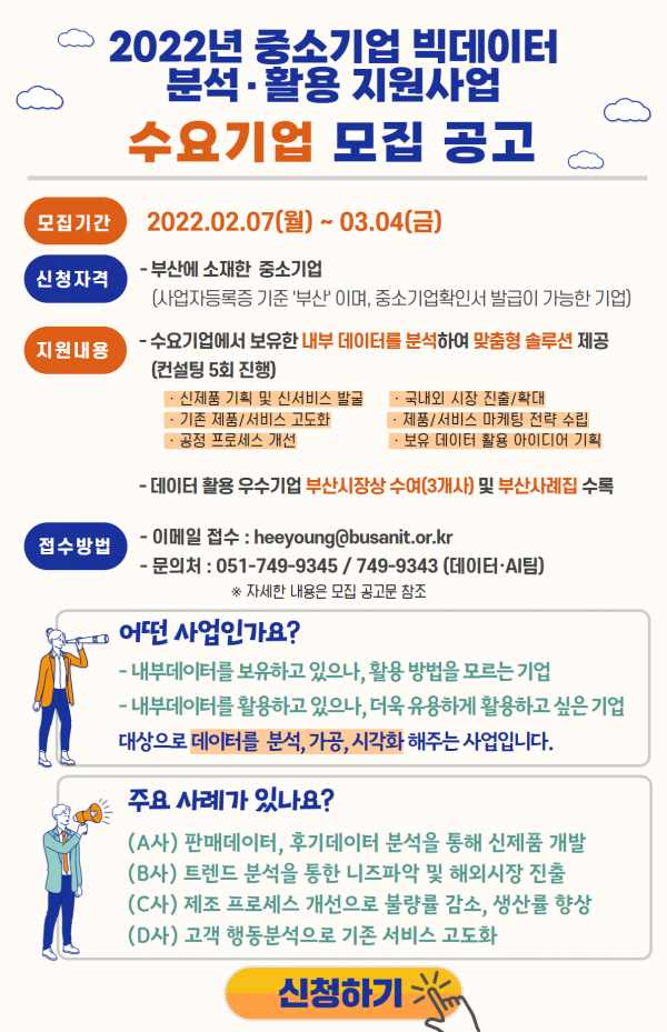 [충청뉴스큐] 부산시는 지역 빅데이터 산업 활성화 및 기업의 데이터 활용 자생력 강화를 위해 ‘중소기업 빅데이터 분석·활용 지원 사업’을 추진하고 사업에 참여할 기업을 3월 4일까지 모집한다고 밝혔다.