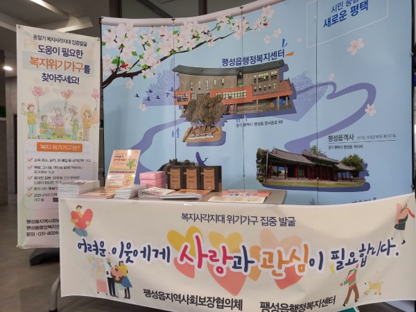 이번 캠페인은 코로나19의 급격한 확산으로 인해 비대면으로 진행하고 있으며 사회적 거리두기가 지속됨에 따라 소외되기 쉬운 복지사각지대 위기가구를 적극 발굴하기 위해 팽성읍행정복지센터 1층 입구에 부스를 마련해 리플릿 및 홍보물품을 비치했다.