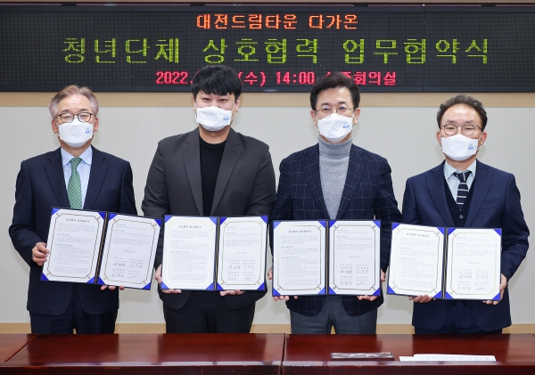 [충청뉴스큐] 대전시는 16일 대전도시공사, 파인건설컨소시엄, ㈜인터플레이와 대전드림타운‘다가온’홍보를 위한‘청년단체 상호협력 업무협약’을 체결했다고 밝혔다.
