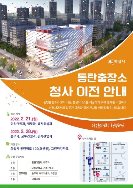 [충청뉴스큐] 화성시 동탄출장소가 보다 나은 행정서비스 제공을 위해 동탄역로 122에 위치한 그린파킹파크로 이전하고 오는 21일부터 신청사 업무를 개시한다.