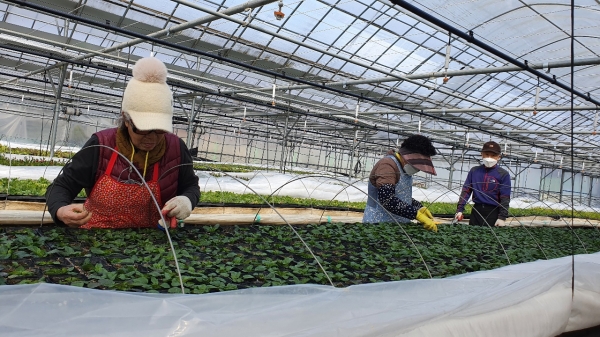 청주시 월오동 꽃묘장 비닐하우스에서는 가자니아, 팬지, 비올라, 버베나, 크리산세멈 등 봄 꽃묘 14종 16만 본 포트 이식 작업을 하고 있다.
