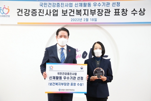 [충청뉴스큐] 안양시 만안구보건소가 코로나19 상황에서도 지역사회 신체활동 증진사업을 적극적으로 추진한 성과를 인정받아 보건복지부 장관상을 수상했다고 18일 밝혔다.