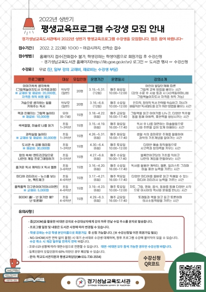 [충청뉴스큐] 경기성남교육도서관이 오는 3월 15일부터 6월 8일까지 도내 유아, 초등학생, 학부모를 대상으로 ‘2022년 상반기 평생교육 프로그램’을 온라인으로 운영한다.