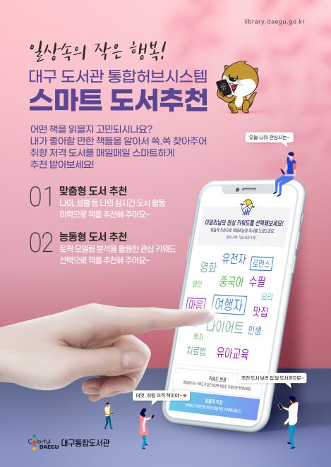 [충청뉴스큐] 대구시는 공공도서관 최초로 이용자 맞춤형 도서추천 모델을 개발해 대구통합도서관 등 도서관 홈페이지에서 서비스하고 있으며 22일부터는 인공지능 기반 토픽 모델링 분석 기법을 적용한 능동형 도서추천 서비스를 제공할 예정이다.