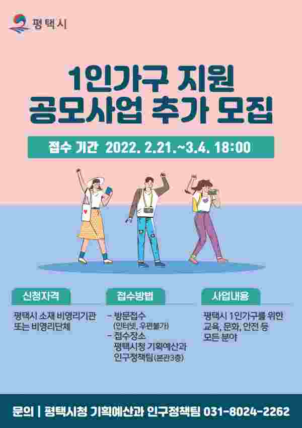 [충청뉴스큐] 평택시는 오는 3월 4일까지 ‘1인가구 지원 공모사업 추가모집’을 진행한다고 밝혔다.