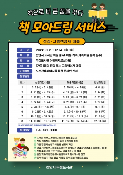 ‘책 모아드림 서비스’는 천안시도서관 정회원 중 가족회원으로 등록한 유·아동 가족을 대상으로 1가족당 1전집 대출 가능하며 도서관 홈페이지에서 온라인으로 신청해 이용할 수 있다.