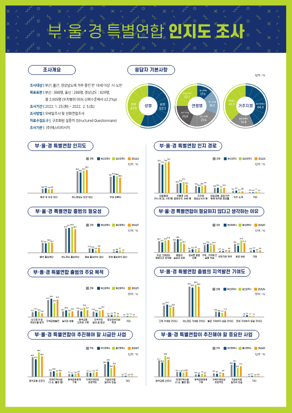 설문조사는 부울경 특별연합에 대한 인지 여부 및 필요성 향후 추진사업에 대한 우선순위 특별연합 출범 후 기대효과 등 총 17개 문항에 대해 이루어졌으며 주요 항목에 대한 세부 결과는 다음과 같다.