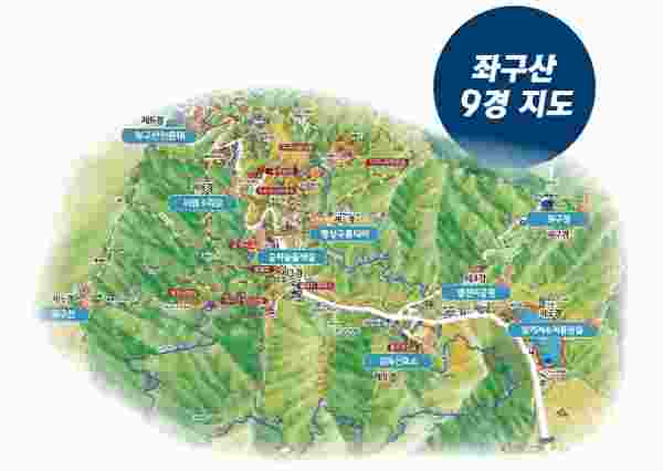 좌구산 9경으로는 제1경 명상구름다리, 2경 삼기저수지 등잔길, 3경 숲하늘둘레길, 4경 별천지공원, 5경 좌구산, 6경 좌구산천문대, 7경 좌구정, 8경 바람소리길, 9경 김득신 묘소가 있다.