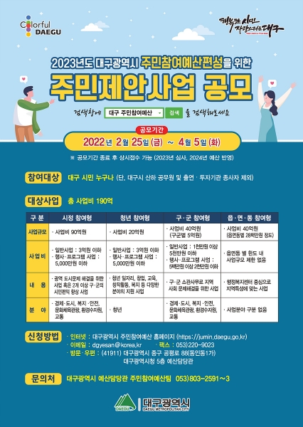 [충청뉴스큐] 대구시는 2023년 주민참여예산 편성을 위한 주민제안사업을 2월 25일부터 4월 5일까지 40일간 홈페이지·이메일·우편·팩스·방문 등을 통해 공모 접수한다.