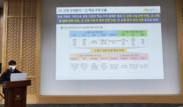 ‘수원시 공원민원 분석’은 수원시 공원민원 데이터를 분석해 공원별 민원 현황을 분석하고 세부 주제별로 상세하게 민원을 분석한 것이다.