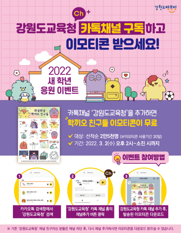 [충청뉴스큐] 강원도교육청은 2일 오후 2시부터, 강원도교육청 카톡채널 신규 가입자 선착순 2만 5천 명에게 이모티콘을 무료로 배포한다.